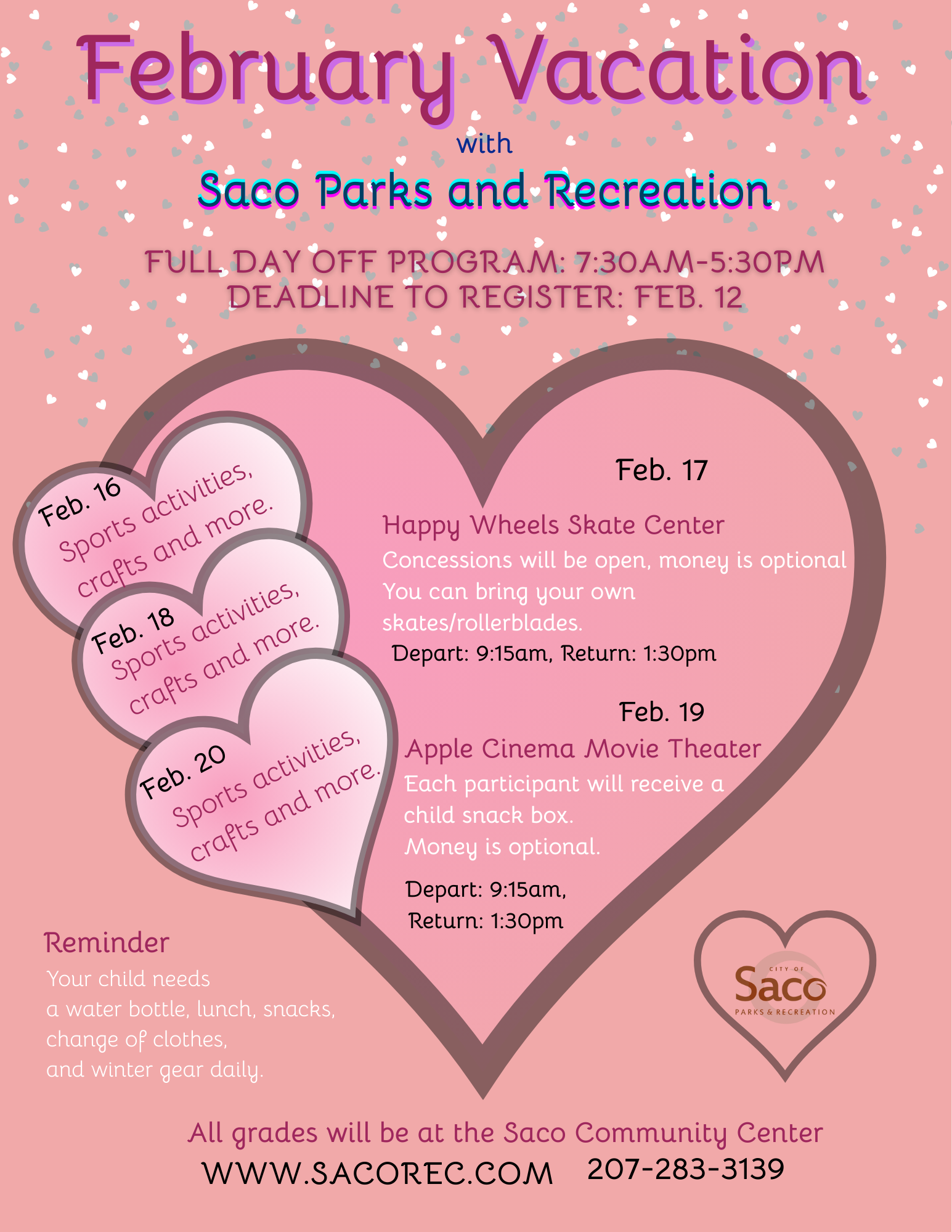 * Full Days Off PreK-5th grade: Offered on vacation days, teacher professional development days, and holiday weeks - Open to Saco and Dayton students enrolled in the School's Out Program!