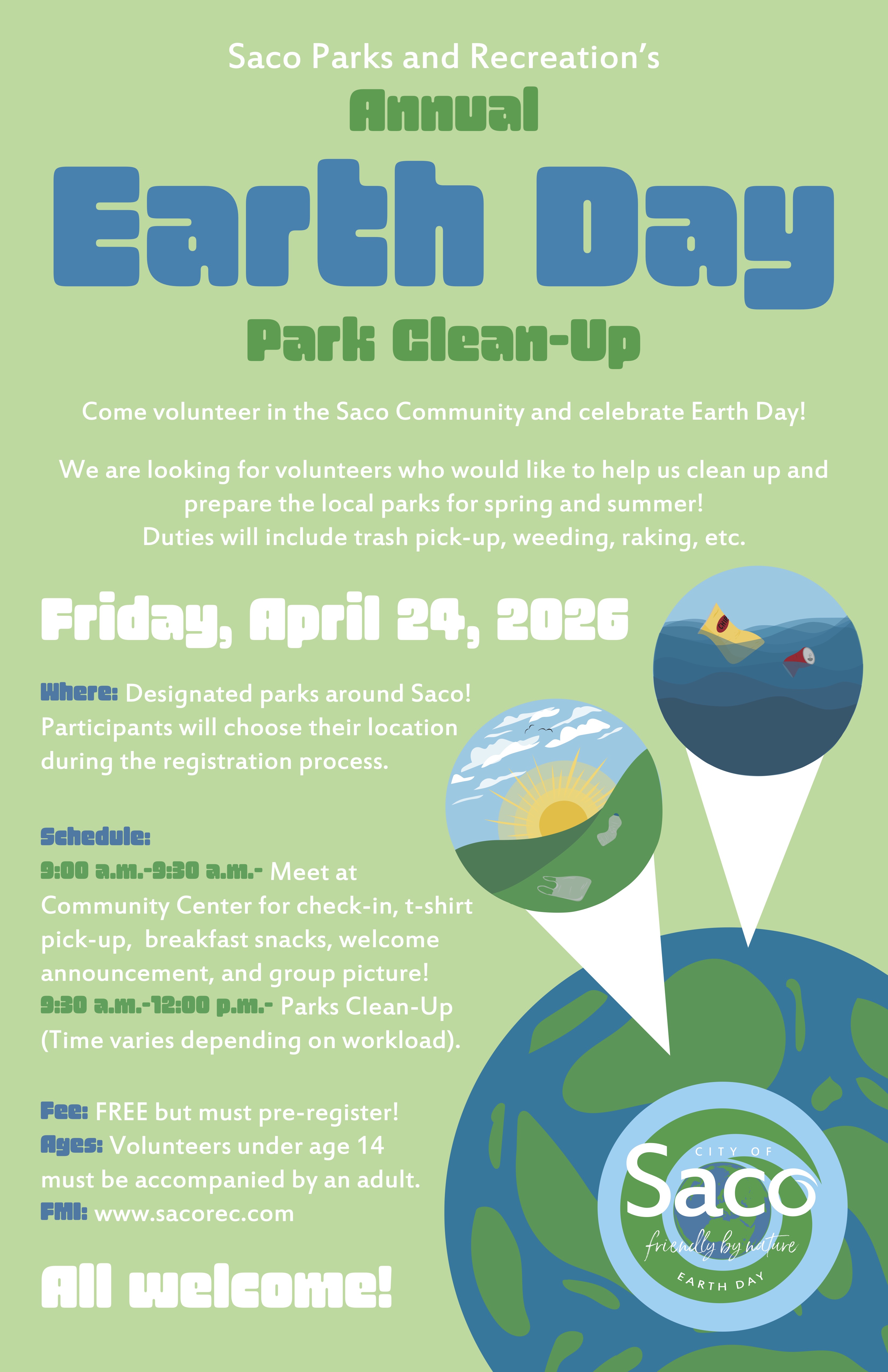 Join us to volunteer in the Saco Community and celebrate Earth Day! We are looking for volunteers who would like to clean up and prepare the local parks for spring and summer. Duties include trash pick-up, weeding, mulching, raking, etc. This event is (light) rain or shine!