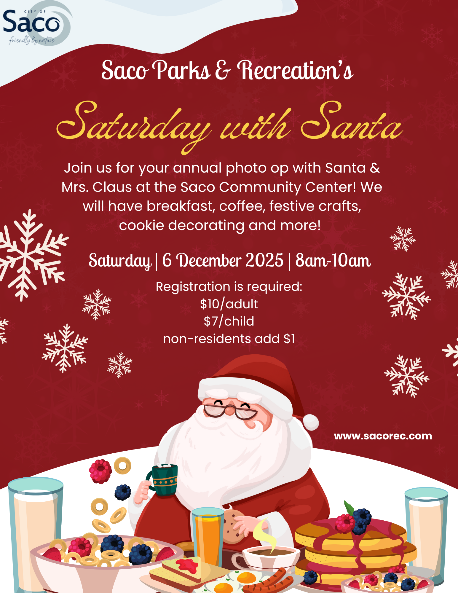 Spend your Saturday with us and come visit Santa and Mrs. Claus! We are so lucky to have them visit the Saco Community Center every year. This event features breakfast and drinks including pancakes, bacon, breakfast potatoes, coffee, and juice. We'll have photo ops with Santa and Olaf, festive crafts, cookie decorating, a hot chocolate bar, and more!
